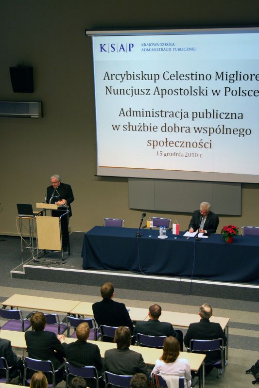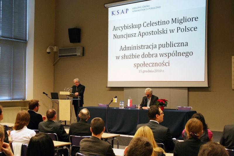 15 grudnia 2010 roku słuchacze KSAP spotkali się z Nuncjuszem Stolicy Apostolskiej w Polsce, arcybiskupem Celestino Migliore. Tematem spotkania była „Administracja publiczna w służbie dobra wspólnego społeczności”. Gość wygłosił przekonanie, że administrację kościelną oraz publiczną – pomimo zorientowania na różne potrzeby człowieka (duchowe oraz świeckie) – łączy wspólna więź w postaci służby osobom i całemu społeczeństwu.