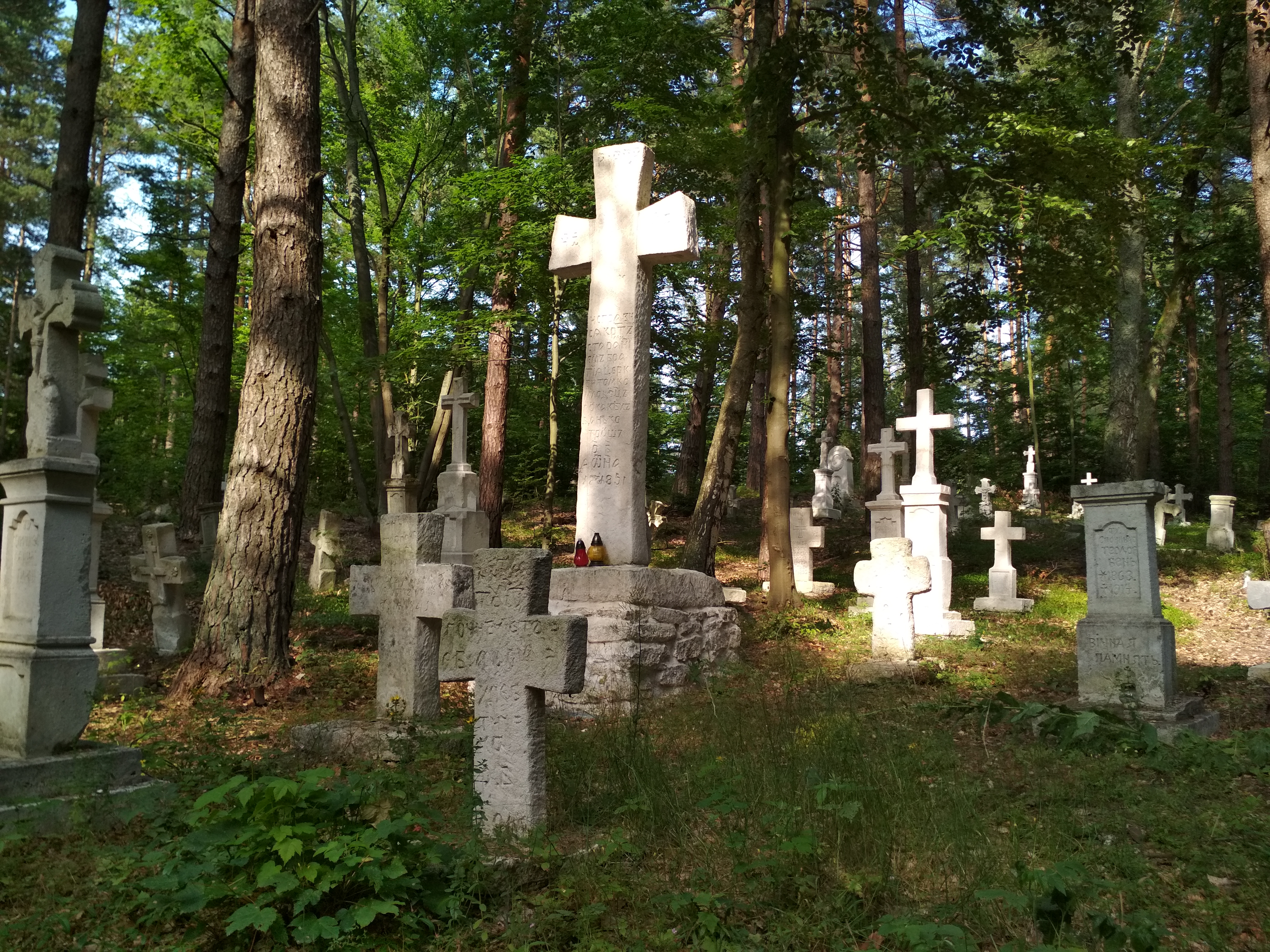 Krzyże i nagrobki w lesie