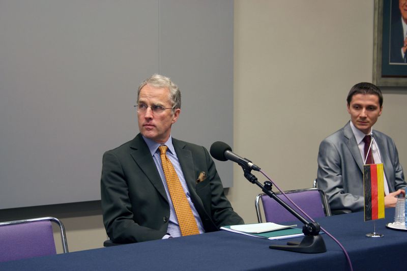Wskazał, że niemiecka konstytucja expressis verbis wyraża ten postulat. Jest w niej mowa o dążeniu do dobrobytu i pokoju jako naczelnych wartościach – podwalinach Państwa Niemieckiego. Przywołując przykłady historyczne i gorzkie doświadczenia krwawych konfliktów gość wskazał jak kruchym może być pokój. Należy o niego dbać nieustannie, mimo że w dzisiejszych czasach wydaje się on być czymś naturalnym. Wielką estymą powinni cieszyć się ojcowie integracji europejskiej, którzy świadomi partykularnych interesów narodowych, wyżej postawili wspólny europejski cel. To założenie przyświecało Republice Federalnej Niemiec, która od przeszło 50 lat jest motorem integracji.