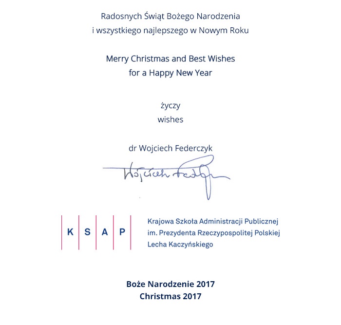 Słuchaczom, pracownikom, absolwentom i wszystkim przyjaciołom KSAP Dyrektor Wojciech Federczyk życzy radosnych Świąt Bożego Narodzenia i wszystkiego najlepszego w Nowym Roku!